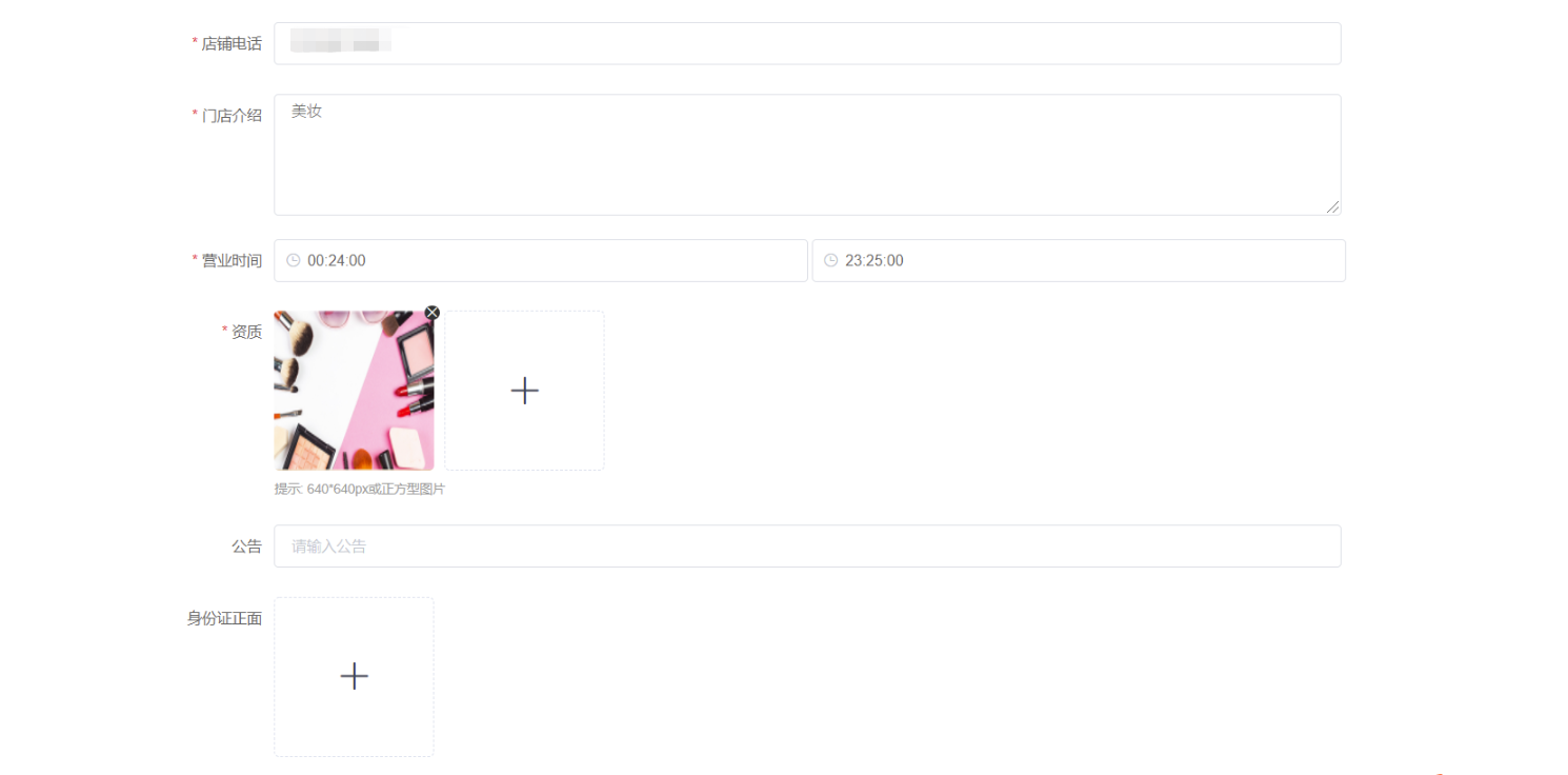 申请通过/后台添加的门店,在门店信息显示,可搜索查看门店的id、名称、所在省市详细地址、门店店长、门店分类、入驻时间、累计实收金额、未结算金额、收银台二维码、门店小程序码等
