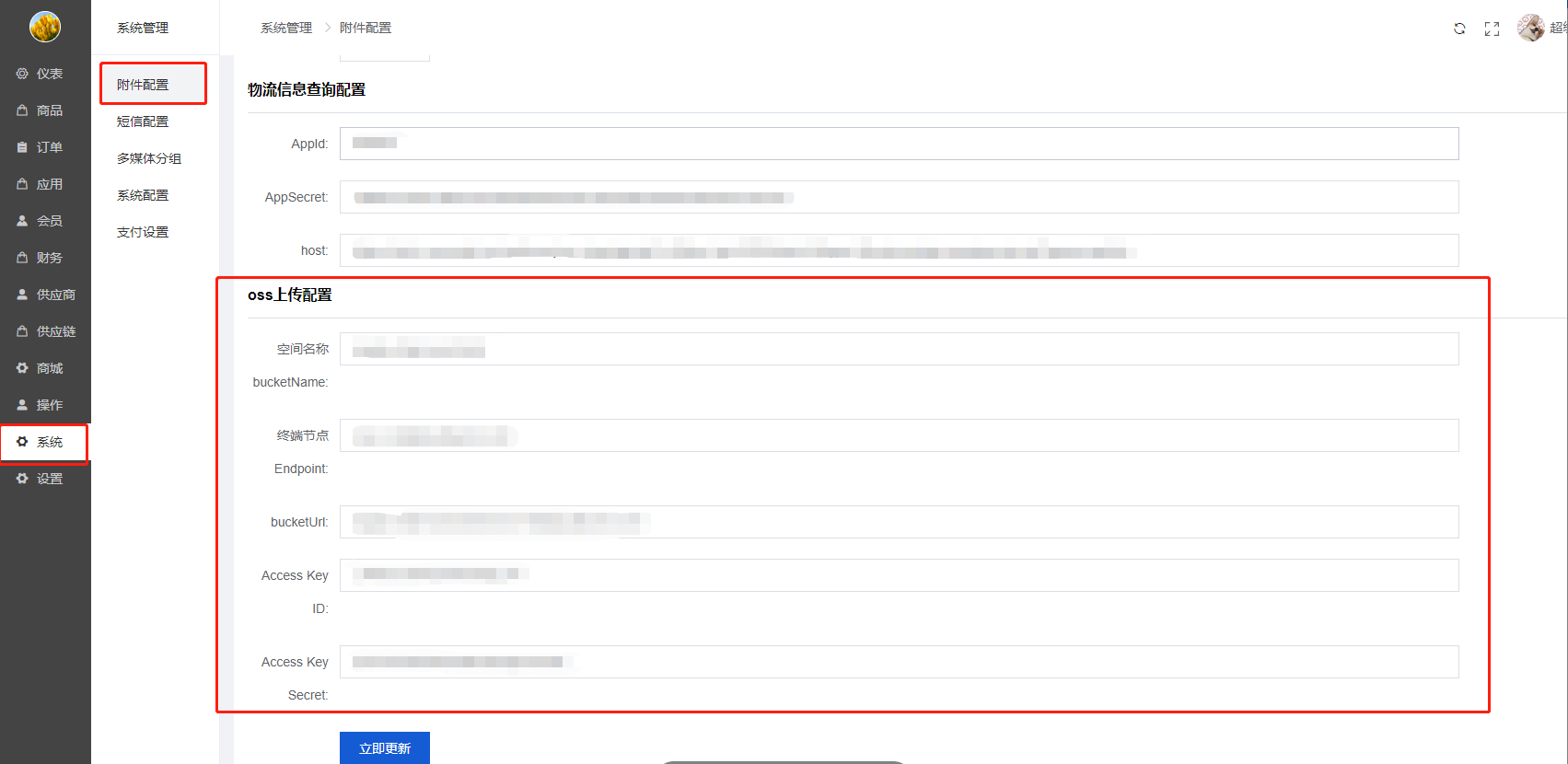 1)附件设置:商城对象存储服务,选择好oss类型,填写oss配置