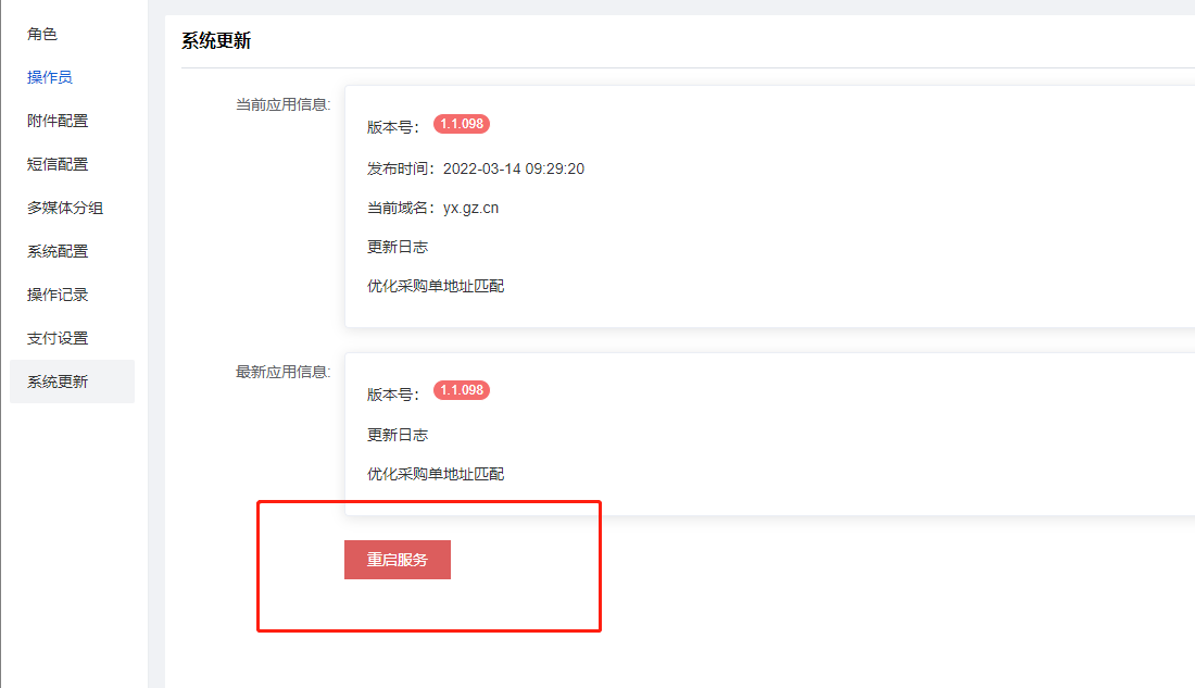 更新后,系统10秒后会自动重启服务,有特殊情况(如问题更新后没有解决),可刷新页面,重启服务再看下~